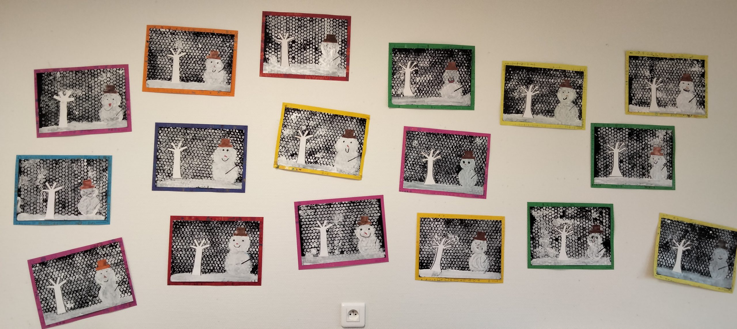 Après l’épisode neigeux de janvier, nous avons fait à la peinture des bonhommes de neige.