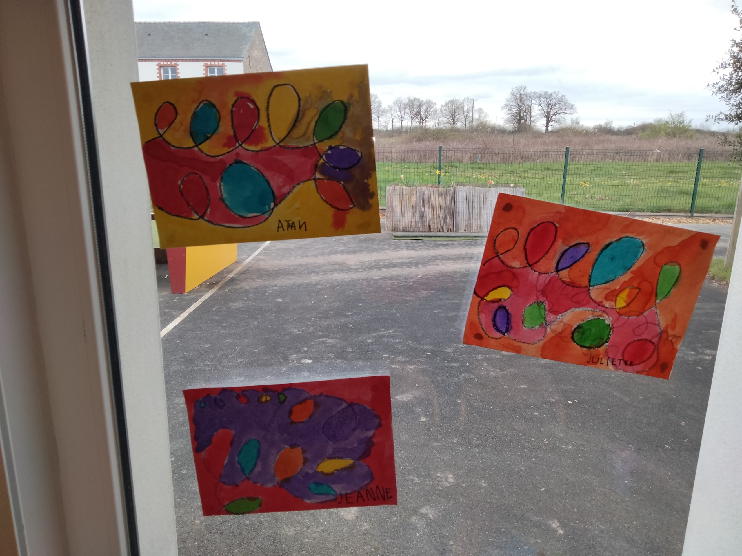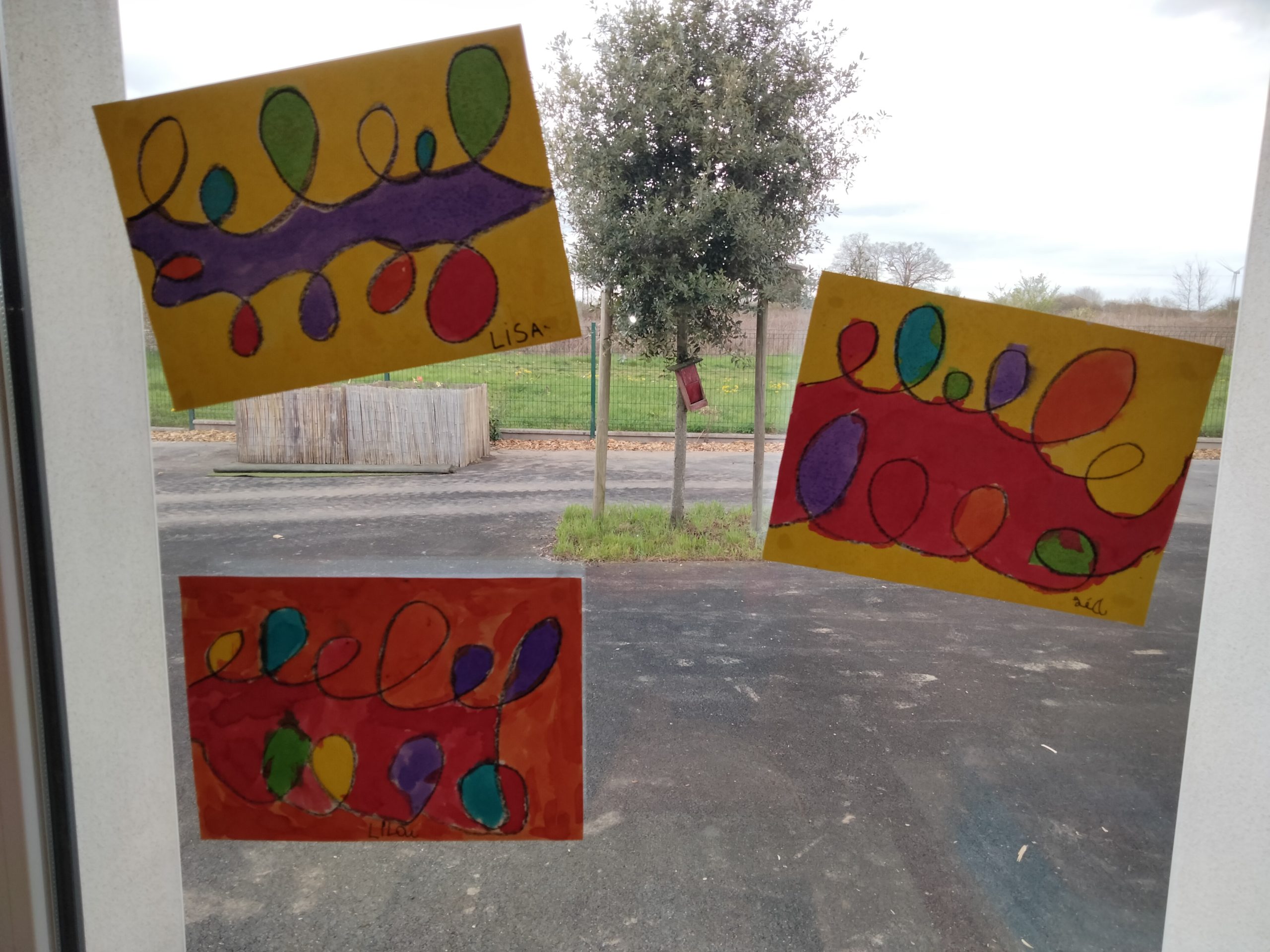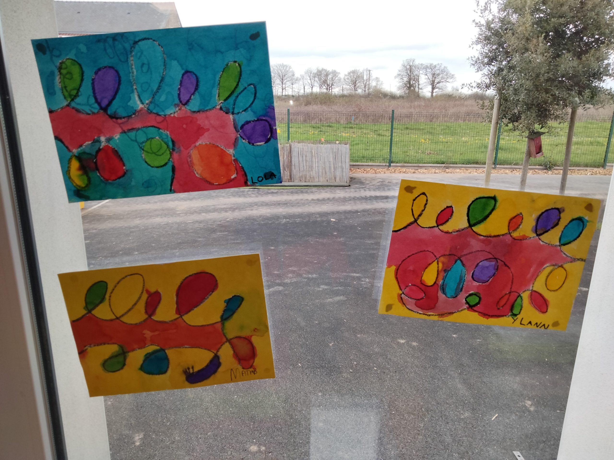 En arts visuels, les GS ont tracé des boucles à la craie grasse, puis ils ont rempli les espaces avec de l’encre de couleur.